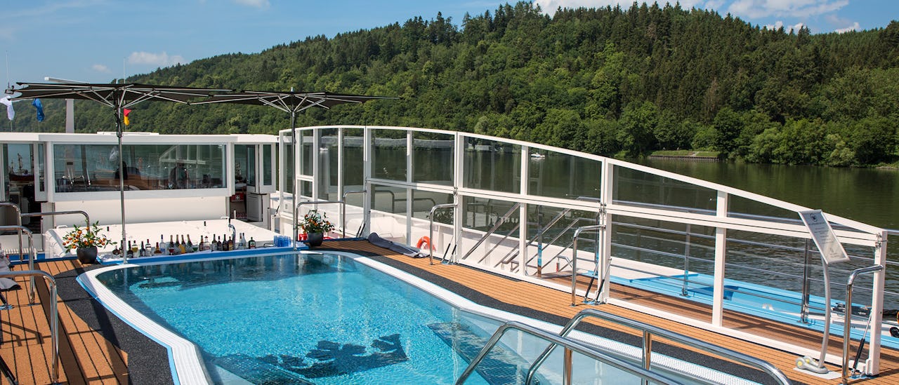 Slapp av med en beroligende massasje eller ta en svømmetur i bassenget med egen svømmebar mens skipet passerer flere hundre år gamle slott, sjarmerende landsbyer og annen storslått natur.