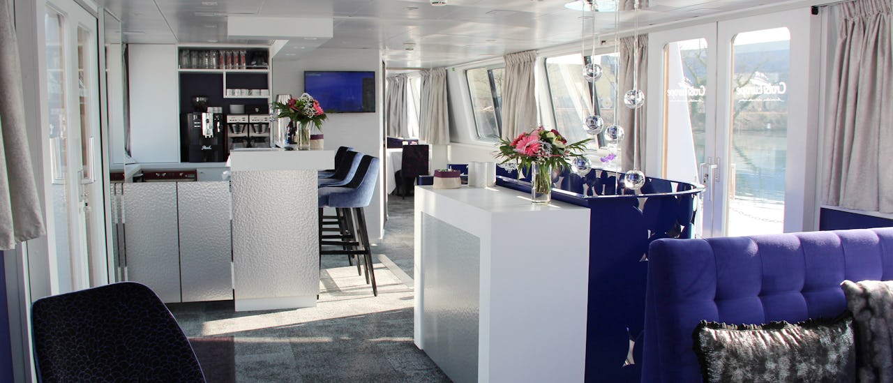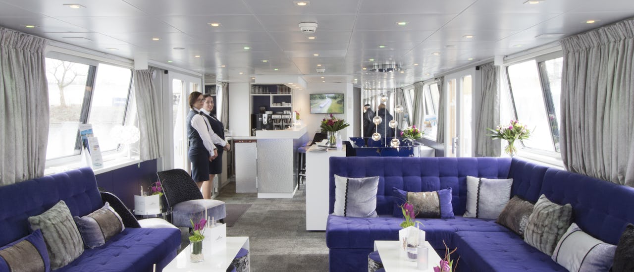 Salongen er smakfullt innredet og tilbyr panoramautsikt. Cocktailer og spill, dans og andre former for underholdning skjer her.
