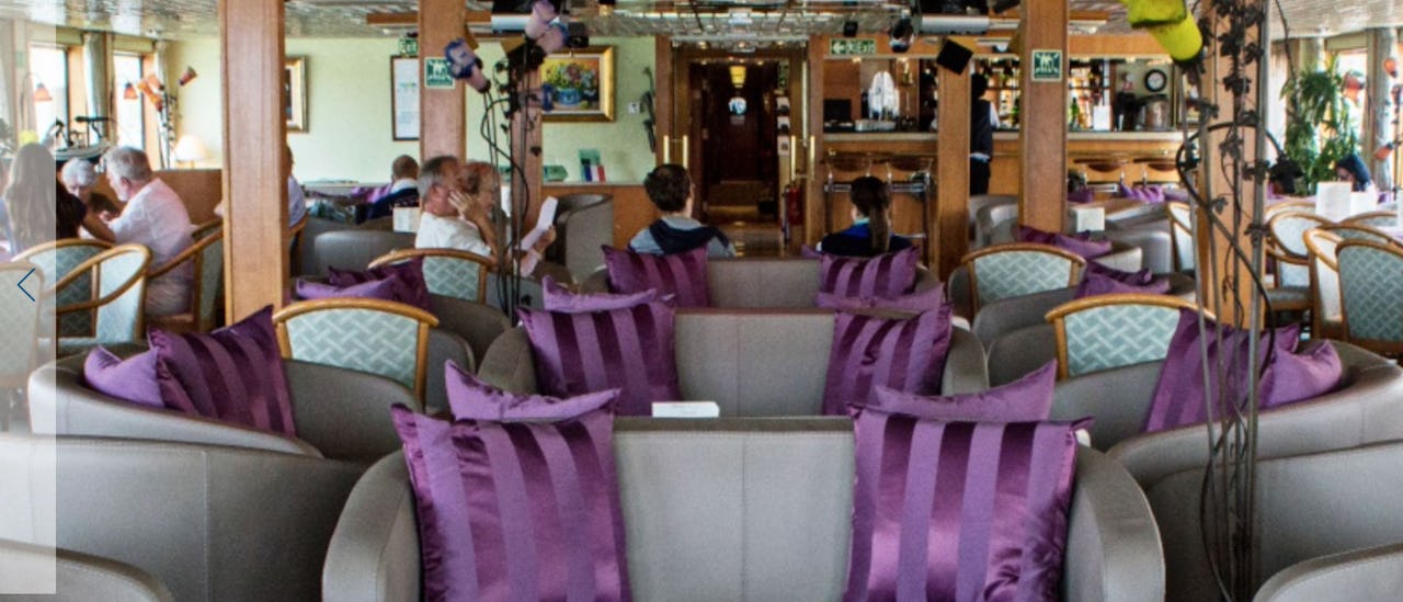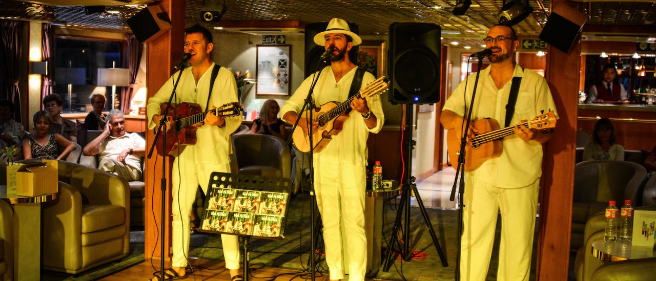 Lytt til og dans til levende musikk i hoved-salongen foran på skipet.