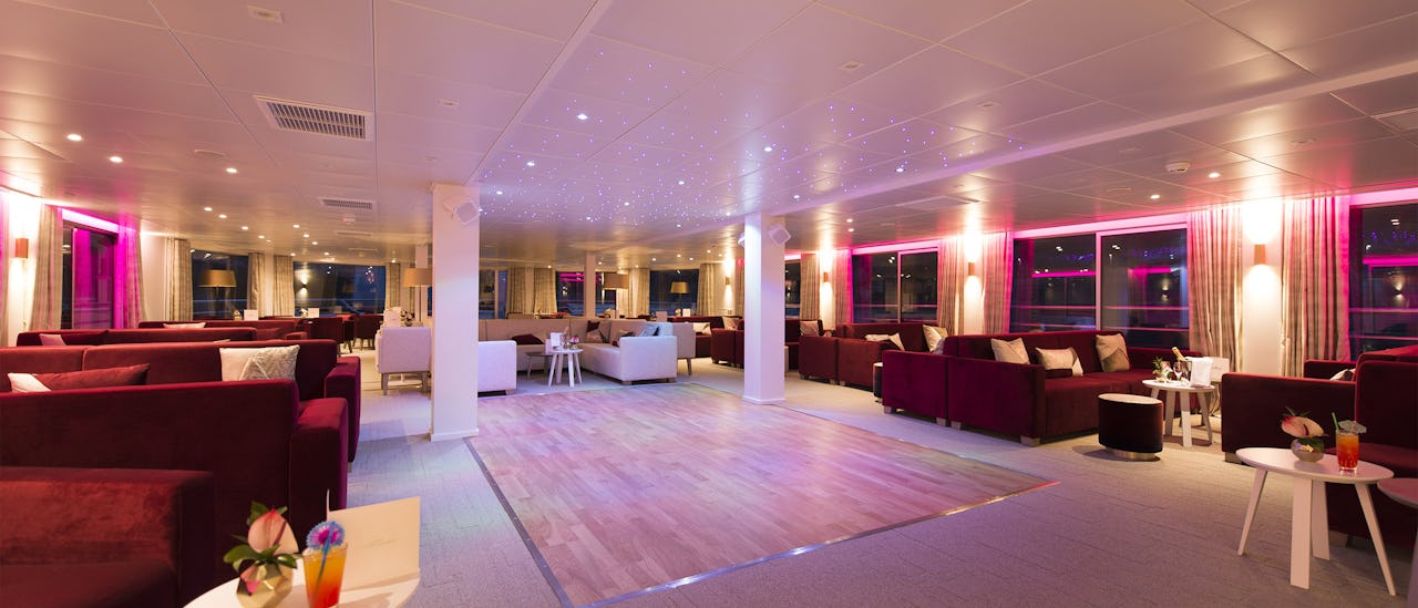 Salongen er smakfullt innredet, ligger på forsiden av skipet og tilbyr panoramautsikt. Cocktailer og spill, dans og andre former for underholdning skjer her.
