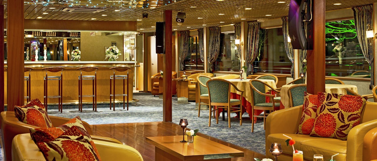 Den smakfullt innredede salongen ligger på forsiden av skipet og tilbyr panoramautsikt. Cocktailer og spill, dans og andre former for underholdning skjer her.