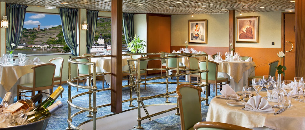 Restauranten ligger på øvre dekk og er der alle måltider serveres under cruiset. Den har plass til alle gjester ved bord som varierer i størrelse med panoramautsikt. Atmosfæren er uformell, men elegant.
