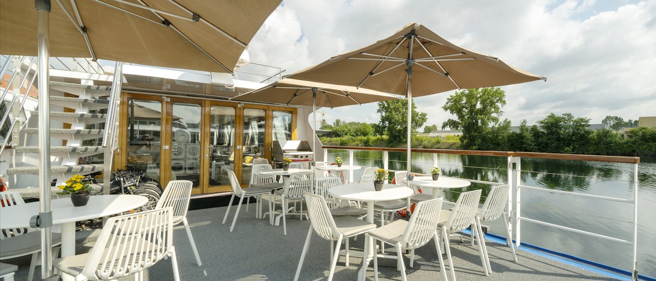 Plassert foran på lekteren og utstyrt med bord og parasoller, kan du enkelt dele et øyeblikk med venner mens du nyter utsikte