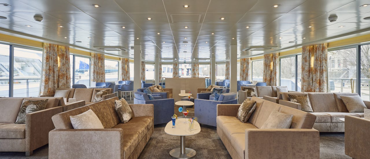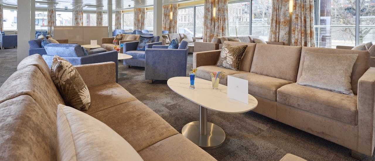 Salongen er smakfullt innredet, ligger på forsiden av skipet og tilbyr panoramautsikt. Cocktailer og spill, dans og andre former for underholdning skjer her.