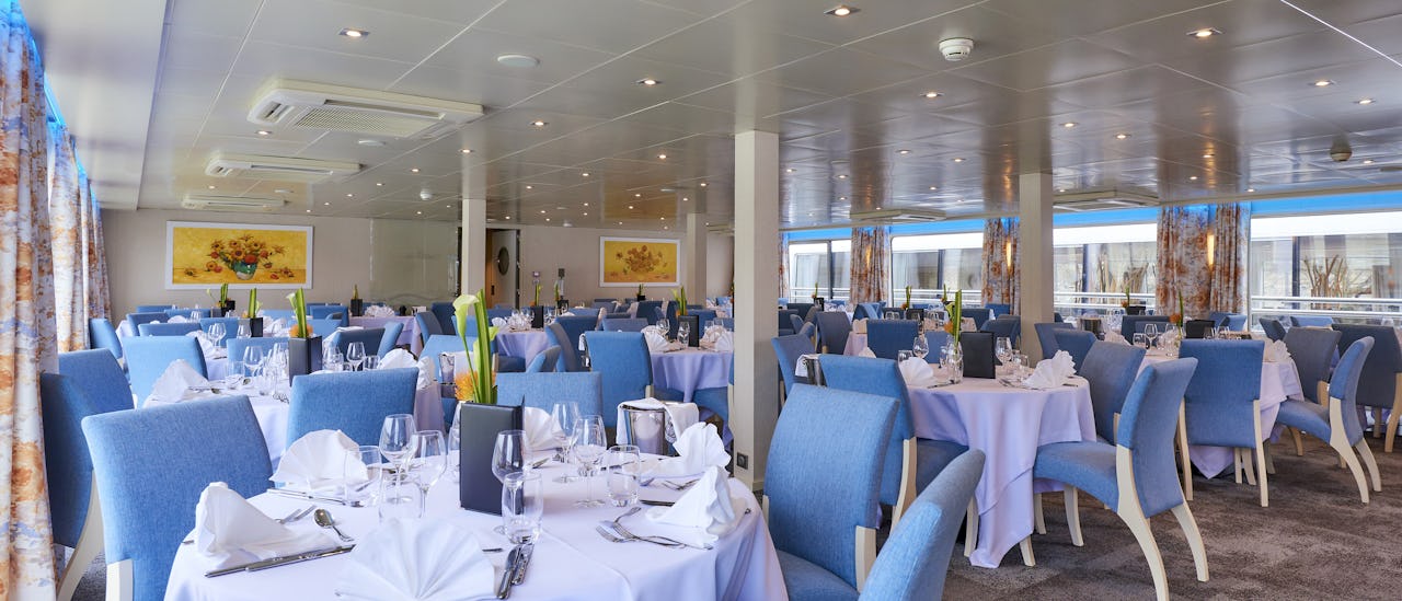 Restauranten ligger på øvre dekk og det er der alle måltider serveres under cruiset. Den har plass til alle gjester ved bord som varierer i størrelse med panoramautsikt. Atmosfæren er uformell, men elegant.