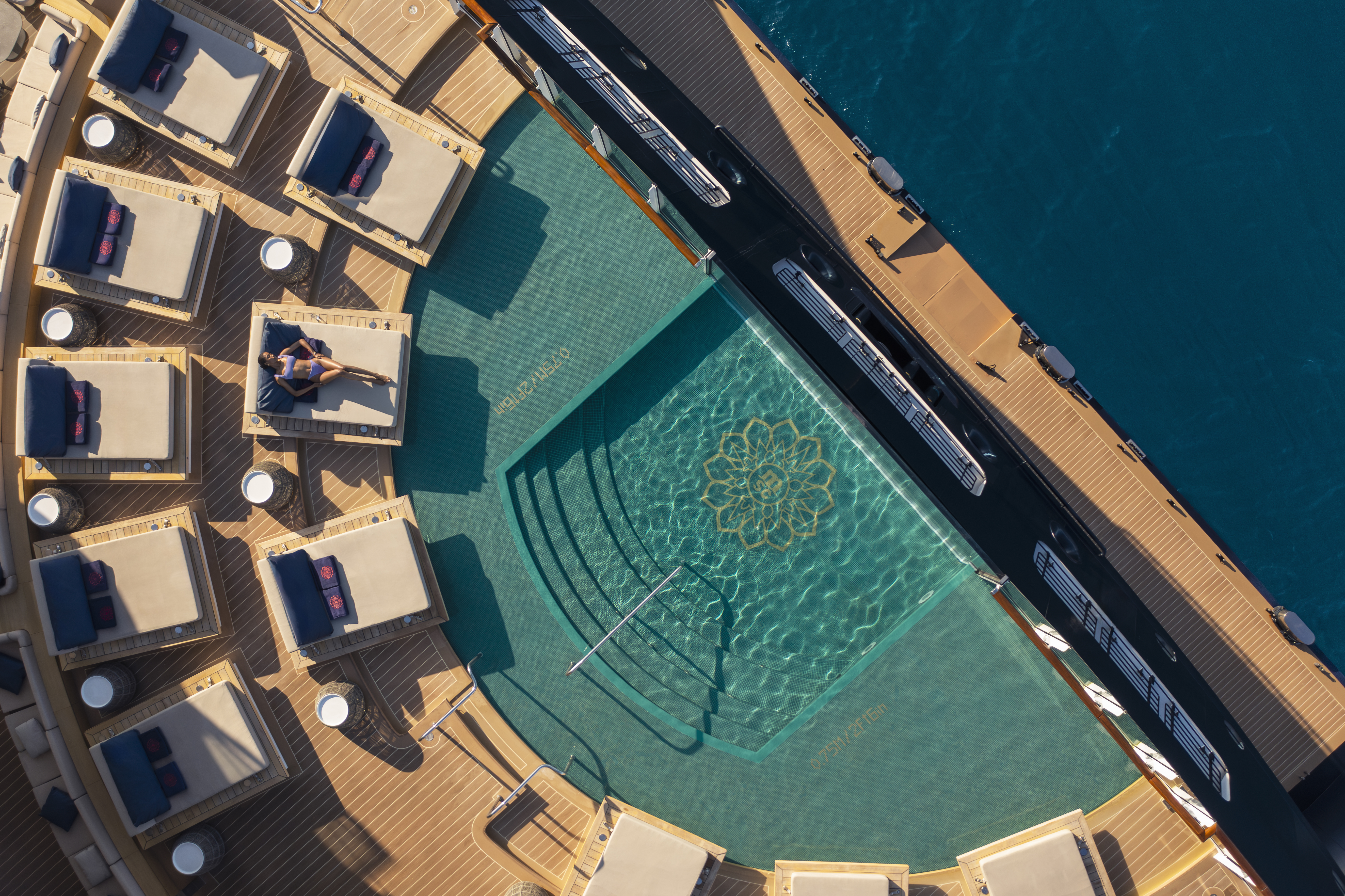 Sjenerøse utendørsterrasser vil skilte med mer enn 2500 kvm som gir fantastisk utsikt over havet, med 64 private lugarer fordelt på 3 utendørs-bassenger.