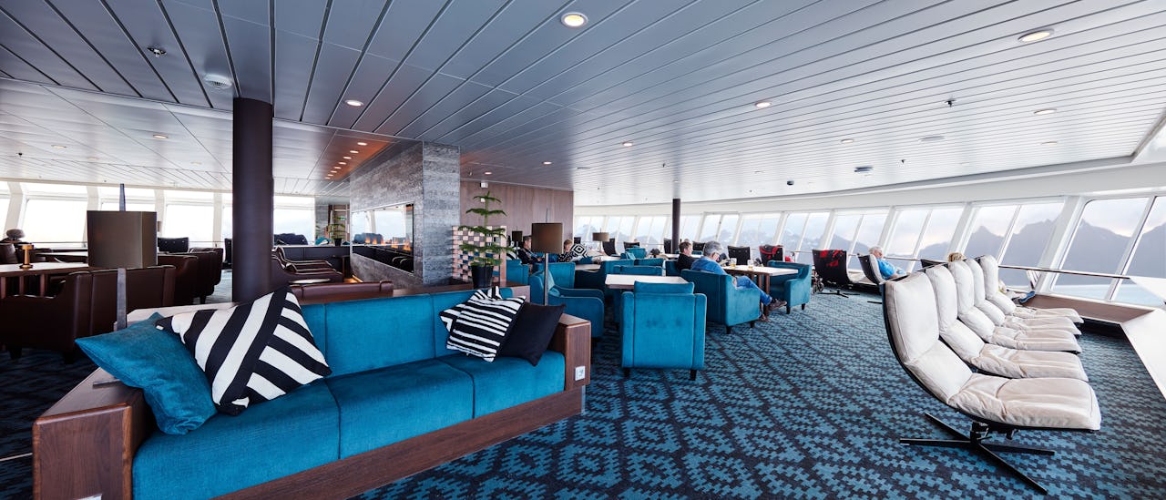 Foran på skipet kan du nyte en klassisk drink i den hyggelige baren.