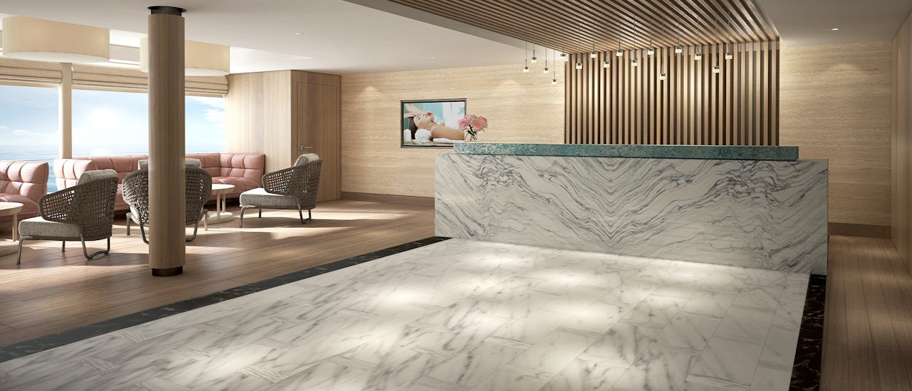 Helt øverst finnes det flere bassenger, spaavdeling og treningsstudio med fantastisk havutsikt.