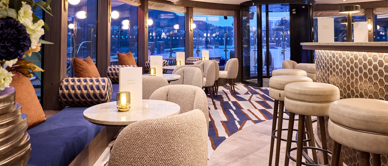 Nyt utsikten over det forbipasserende landskapet fra panoramavinduene i salongen foran skipet og slapp av om kvelden mens du lytter til pianisten.
