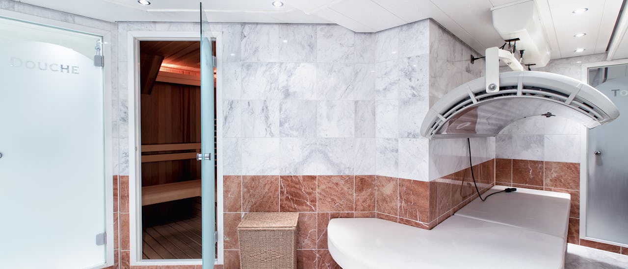 Slapp av på det store soldekket. Her er det mange solsenger nyt utsikten over landskapet og lad opp batteriene i velværeavdelingen med badstue, dampbad og boblebad.