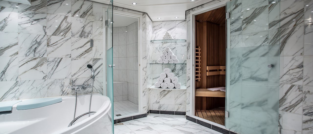 Slapp av på det store soldekket. Her er det mange solsenger, nyt utsikten over landskapet og lad opp batteriene i velværeavdelingen med badstue, dampbad og boblebad.